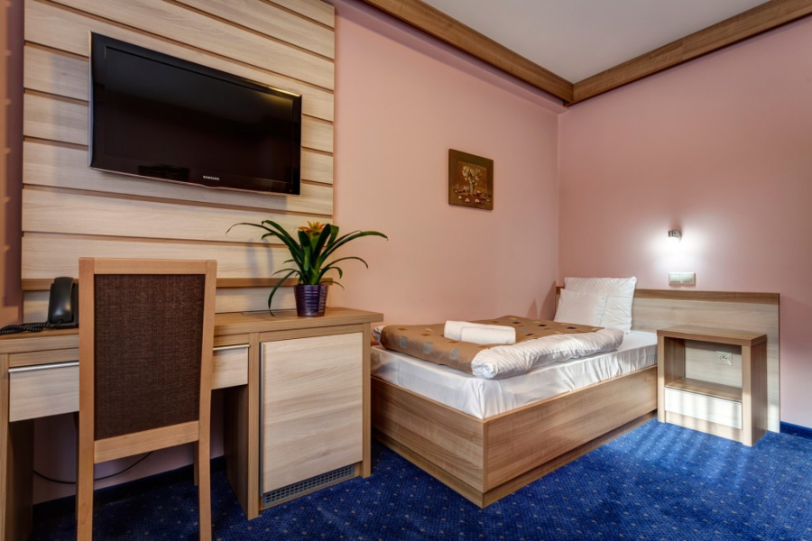 K štandardnému vybaveniu izby patrí telefón, trezor, satelitná TV a Wi-Fi pripojenie,župan, uteráky a osušky.